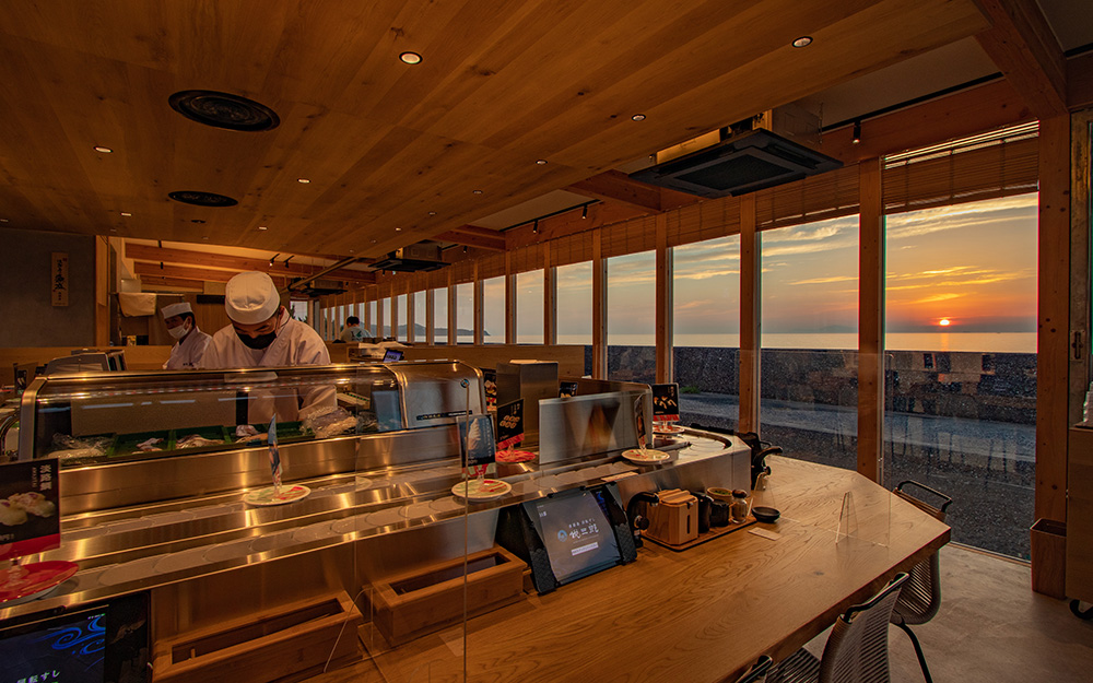 淡路島の水産会社と共同で獲れたて海鮮の回転すし 淡路島 回転すし 悦三郎 地元の水産会社だからこその仕入れ、淡路産直の地魚ネタ、鯛やサ鱧、しらすはもちろん定番のマグロなども目利き人が買い付ける地産地消の回転すし。 徒歩1分ほど。