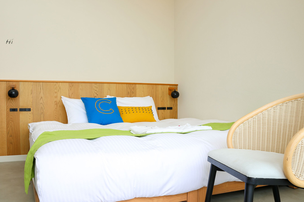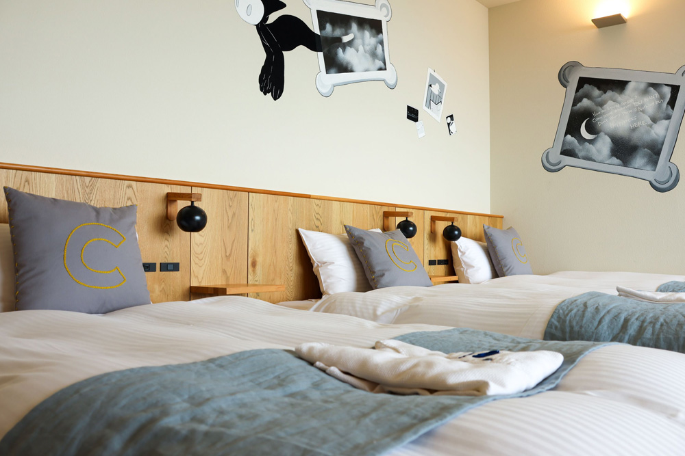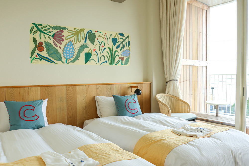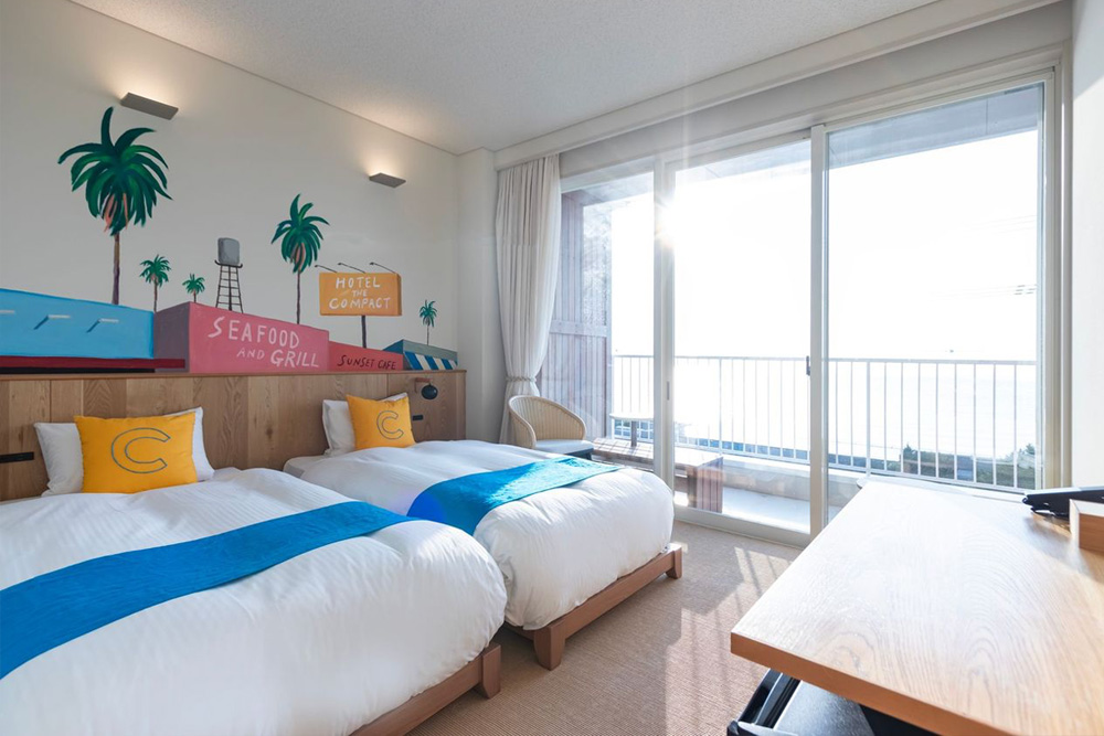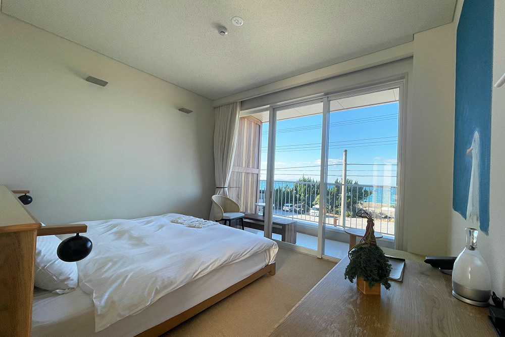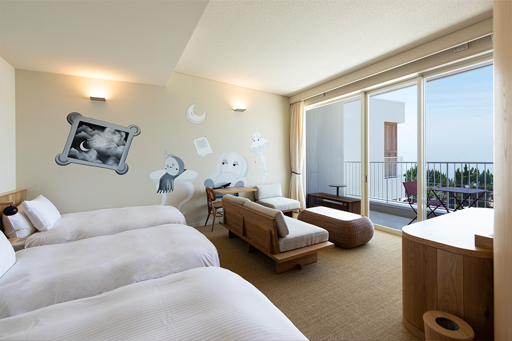 全室オーシャンビューの17室。それぞれのお部屋は10人のアーティストによりライブペイントで彩られたオリジナルアートの壁面。どのお部屋になるかは当日のお楽しみ。夕暮れ時にはお部屋から西海岸の水平線に沈む夕陽もお楽しみ頂けます。美しい夕陽に癒されつつ特別な時間をゆっくりとお過ごしください。