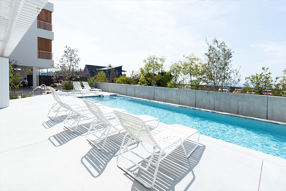 インパクトのあるサウナヒーターとセルフロウリュ、チラー付きの水風呂が設置された最高のととのい環境と、海を眺めながらのプールサイドでゆったりお過ごしください。
